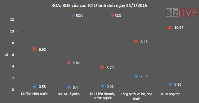 Hiệu quả kinh doanh của hệ thống các TCTD không có gì thay đổi so với tháng trước khi mà ROA và ROE của toàn hệ thống vẫn lần lượt đạt 0,51% và 5,49% trong tháng 1/2015.