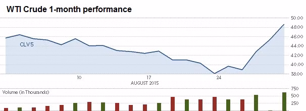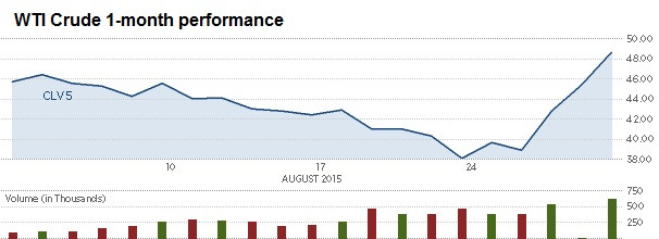 Kết thúc phiên giao dịch, giá dầu WTI giao tháng 10 tăng 3,98 USD, hay 8,8%, lên 49,2 USD/thùng , mức cao nhất kể từ ngày 21/7.