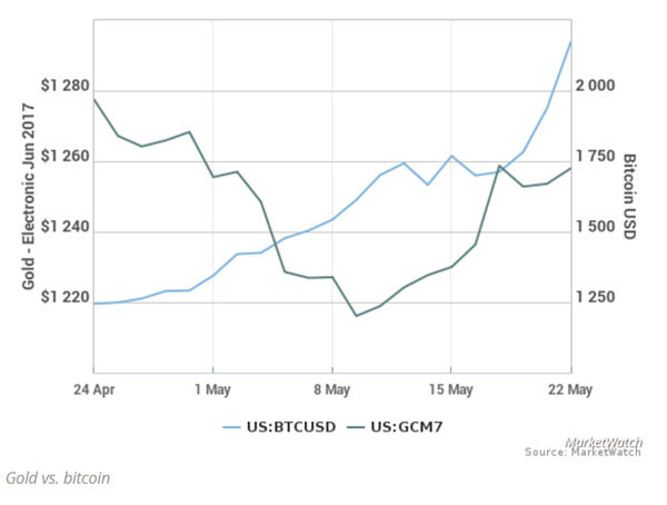 Trong khi cổ phiếu S&P 500 chỉ tăng khoảng 0,1% trong tháng Năm, 1 bitcoin đã tăng khoảng 61% giá trị trong tháng này, leo lên đến mức khoảng 1.344 USD vào đầu tháng. Sự gia tăng này một phần nhờ những chuyển biến lạc quan trong cơ chế quản lý bitcoin, và quyết định của Ủy ban chứng khoán và Sàn giao dịch Mỹ (SEC) xem xét lại việc cho phép giao dịch bằng bitcoin
