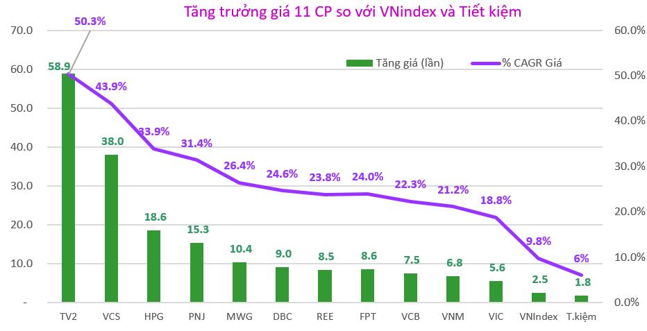 Trong các cổ phiếu được thống kê, TV2 tăng 58,9 lần trong 10 năm hay CAGR 50,3%/năm; DBC tăng 9 lần hay 24,6%/năm, trong khi VNindex tăng 2,5 lần trong cùng giai đoạn, tương ứng CAGR là 9,8%/năm. Gửi tiền tiết kiệm với lãi suất 6%/năm, giá trị cuối kỳ tăng 1,8 lần: