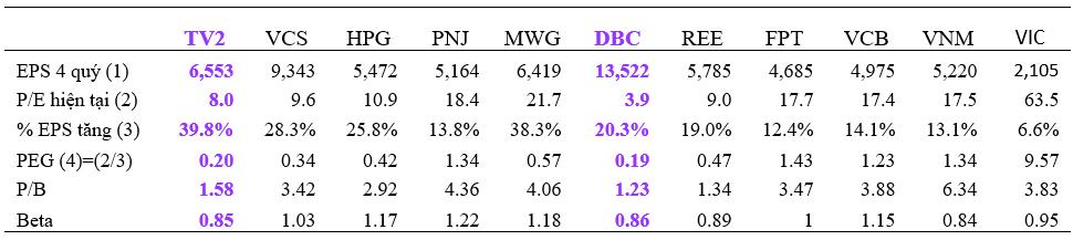 - Tỷ suất PEG, nếu sử dụng tỷ lệ tăng trưởng EPS của 10 năm gần nhất (dòng 3 bảng trên), PEG của DBC & TV2 chỉ là 0,19 và 0,2 thấp hơn 9,3 lần so với 9 CP còn lại là 1,86. Các chuyên gia tài chính và trang web tài chính lớn như fool.com đưa ra lời khuyên nếu PEG < 0,5 mua ngay cổ phiếu đó.