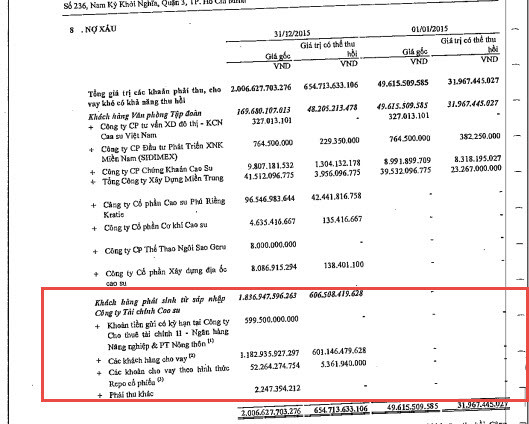Cũng trong thuyết minh BCTC của mình, VRG cũng cho biết, “giá trị có thể thu hồi” thấp hơn nhiều lần “giá gốc”; Cụ thể, các khoản cho khách hàng vay, giá gốc là 3.383 tỷ đồng nhưng “Giá trị có thể thu hồi” chỉ là 603 tỷ, Các khoản cho vay theo hình thức Repo cổ phiếu có giá gốc là 52 tỷ nhưng “Giá trị có thể thu hồi” chỉ vỏn vẹn 5,4 tỷ đồng.