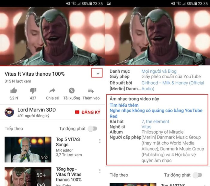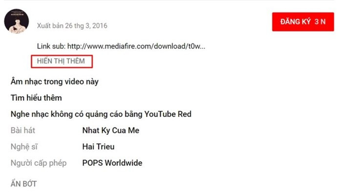 Hiện tính năng này đã được cập nhật cho người dùng YouTube ở Việt Nam. Để biết được tên bài hát trong video nào đó trên YouTube, bạn chỉ cần bấm vào biểu tượng mũi tên hướng xuống hoặc dòng chữ "Hiển thị thêm" bên dưới video là sẽ thấy thông tin về bài hát mà bạn đang tìm kiếm.