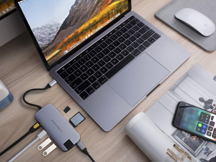 Cổng chuyển Hyperdrive (98 USD) - Điểm hạn chế lớn nhất trên chiếc MacBook Pro 2017 mà tôi đang sử dụng là khả năng kết nối khi chỉ hỗ trợ cổng USB-C. Do đó, cổng chuyển đổi là thứ không thể thiếu. Nó giúp chiếc máy có thêm 2 cổng USB-A, khe cắm thẻ nhớ SD, giắc cắm mạng và cổng HDMI. Ảnh: Hyper.