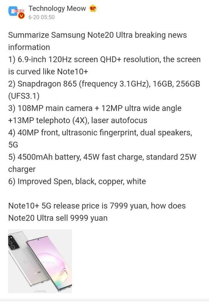 Chi tiết cấu hình của chiếc Galaxy Note 20 Ultra đang được chia sẻ trên các diễn đàn công nghệ. Ảnh: Technology Meow.