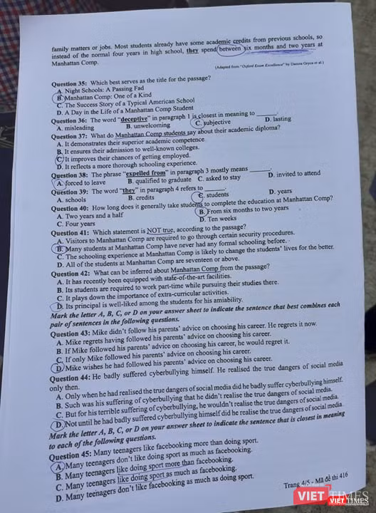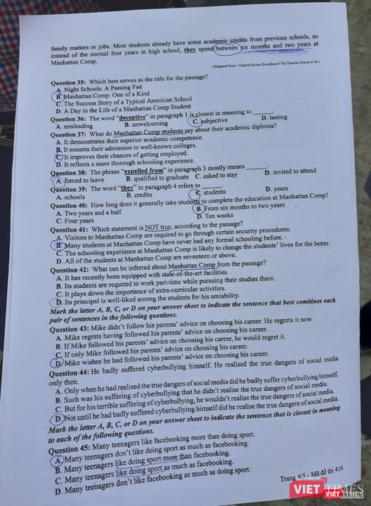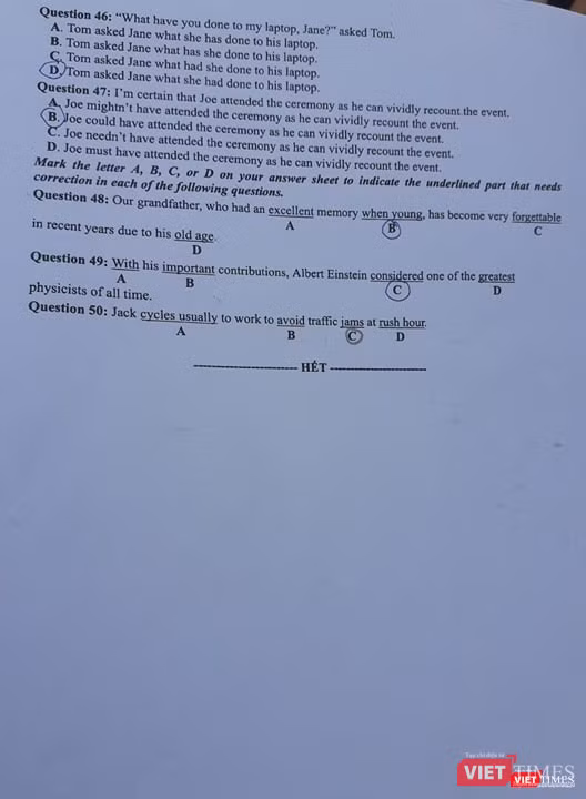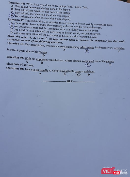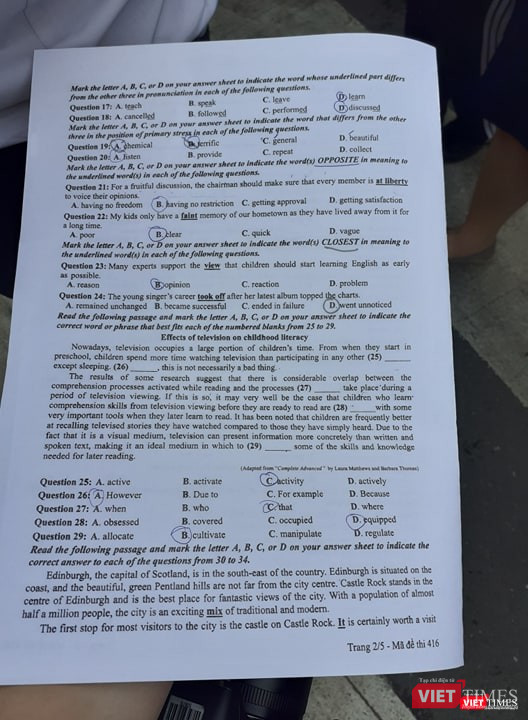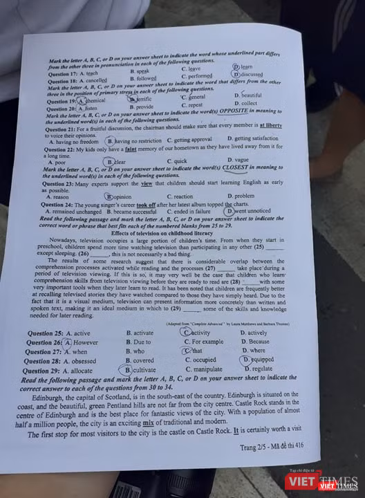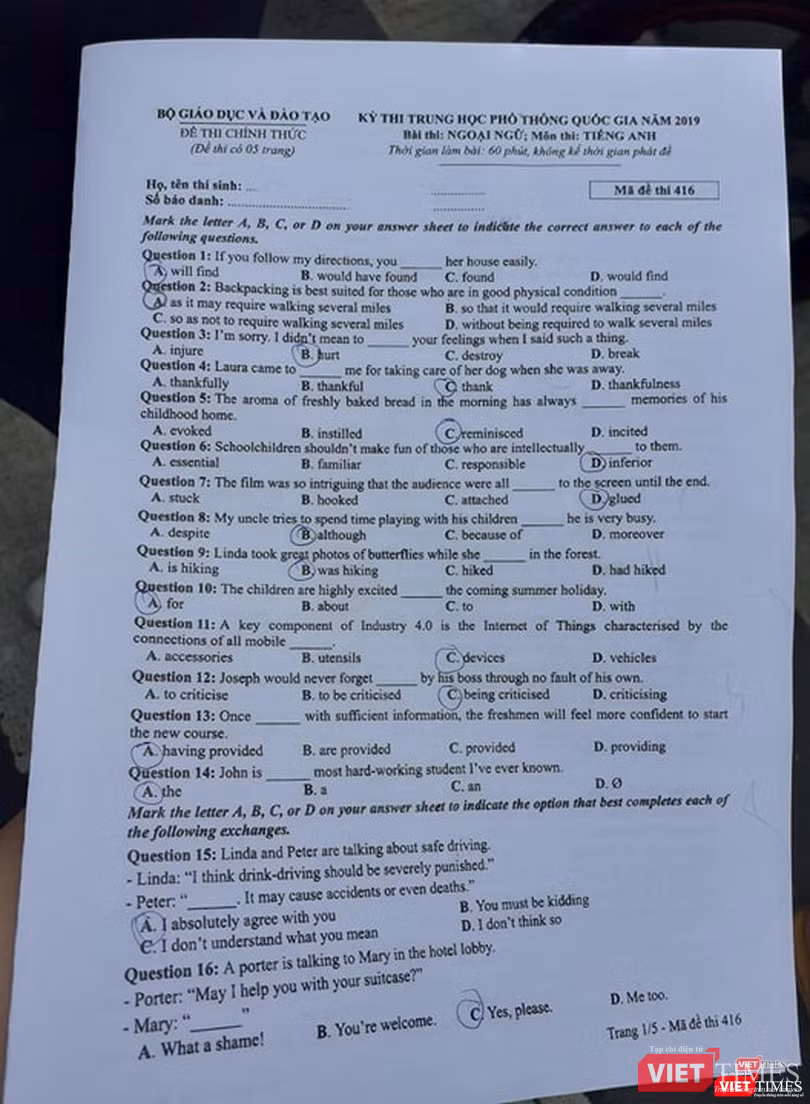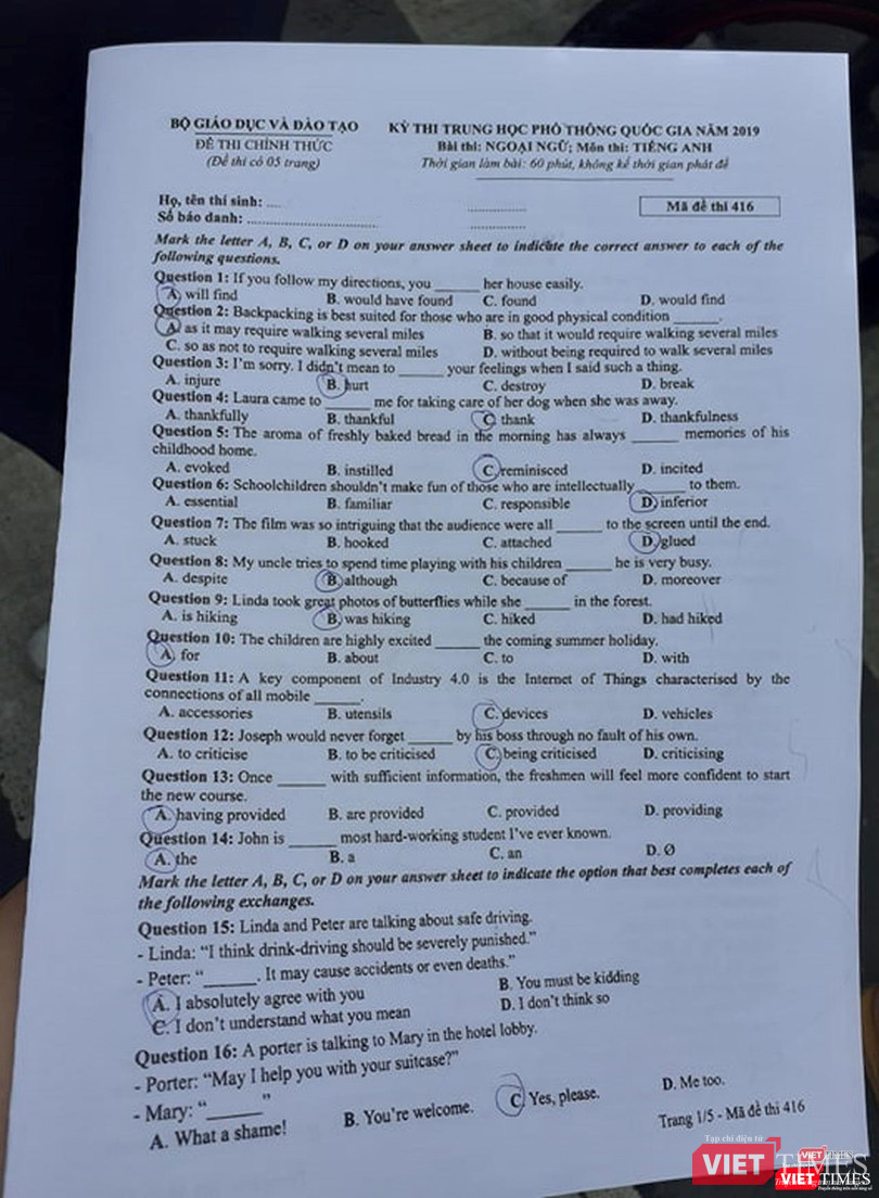VietTimes -- Chiều nay (26/6), thí sinh tiếp tục ngày thi thứ hai kỳ thi THPT Quốc gia 2019 với bài thi trắc nghiệm môn tiếng Anh, thời gian 60 phút. Bước ra khỏi phòng thi, nhiều thí sinh thở phào vì cho rằng đề không khó, ngoại trừ một vài câu khó ở phần từ vựng.