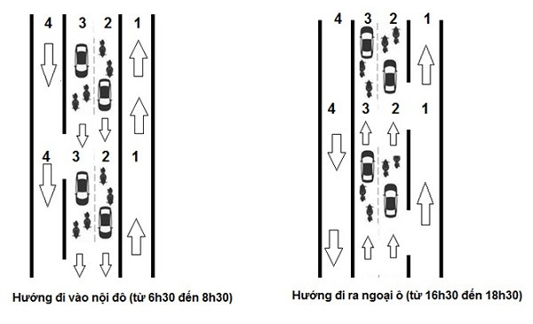 - Buổi sáng (từ 6h30 đến 8h30): Sử dụng làn đường số 2, 3, 4 cho chiều đi từ ngoại thành vào nội thành; làn đường số 1 cho chiều đi từ nội thành ra ngoại thành.