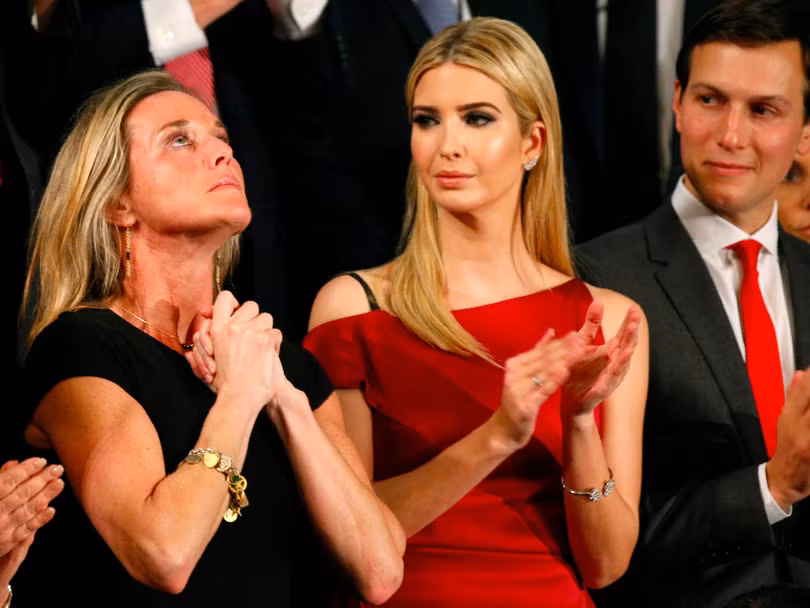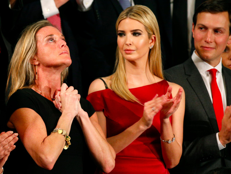Carryn Owens xúc động khi Ivanka Trump và Jared Kushner (con gái và con rể của Tổng thống Trump) vỗ tay khi vinh danh chồng bà. Ảnh REUTERS/Kevin Lamarque