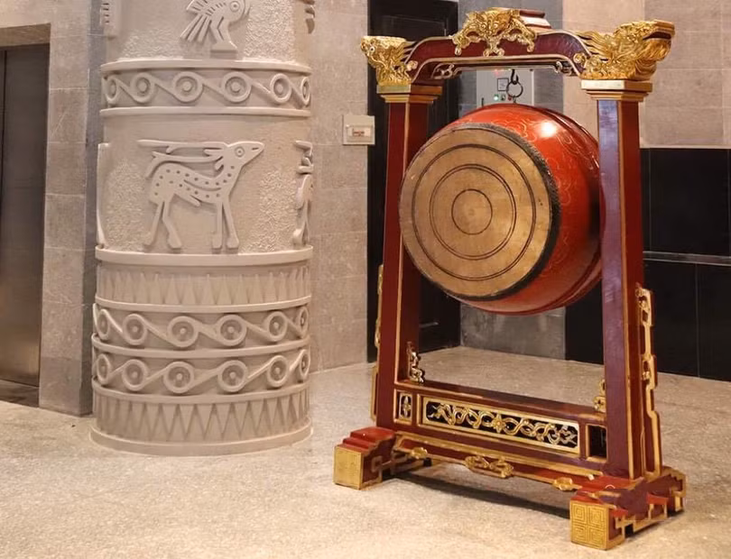 | Nghi môn cao 9m được xây dựng bằng các cột bê tông ốp đá chắc chắn để đỡ các mái. Mái nghi môn mang hình dáng nhà truyền thống của người Việt cổ với họa tiết hoa văn trên trống đồng. |