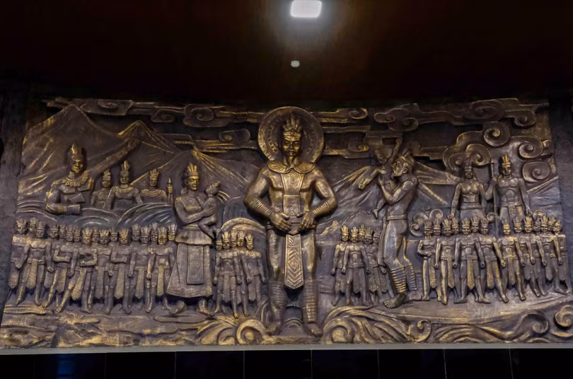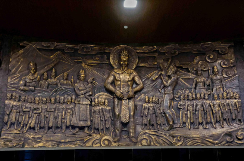 | Hai bức tranh phù điêu được đặt đối xứng tại gian thờ. Một bức phù điêu tái hiện truyền thuyết “Con rồng cháu tiên” và một bức tái hiện các sự tích dưới thời đại các Vua Hùng như sự tích Mai An Tiêm, sự tích bánh Chưng, bánh Giày. |