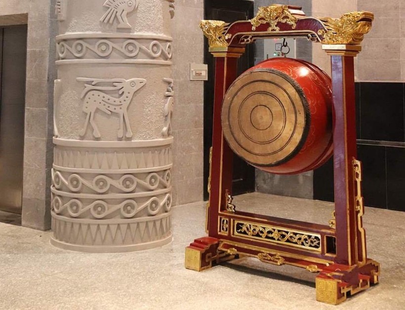 Nghi môn cao 9m được xây dựng bằng các cột bê tông ốp đá chắc chắn để đỡ các mái. Mái nghi môn mang hình dáng nhà truyền thống của người Việt cổ với họa tiết hoa văn trên trống đồng. |