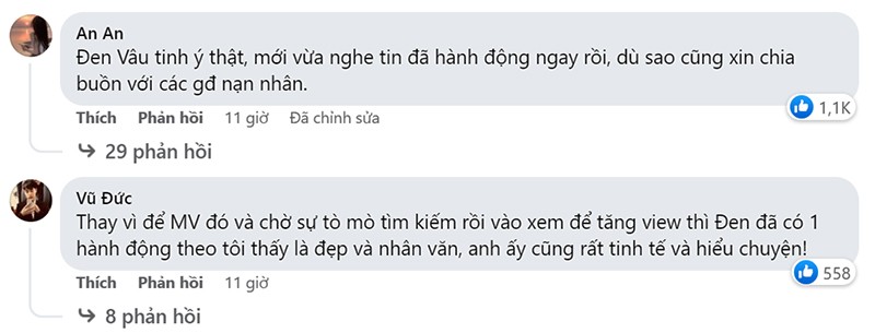 Một người dùng Facebook có nick là An An viết: "Đen Vâu tinh tế thật, vừa nghe tin đã hành động ngay rồi để chia buồn với các gia đình nạn nhân".