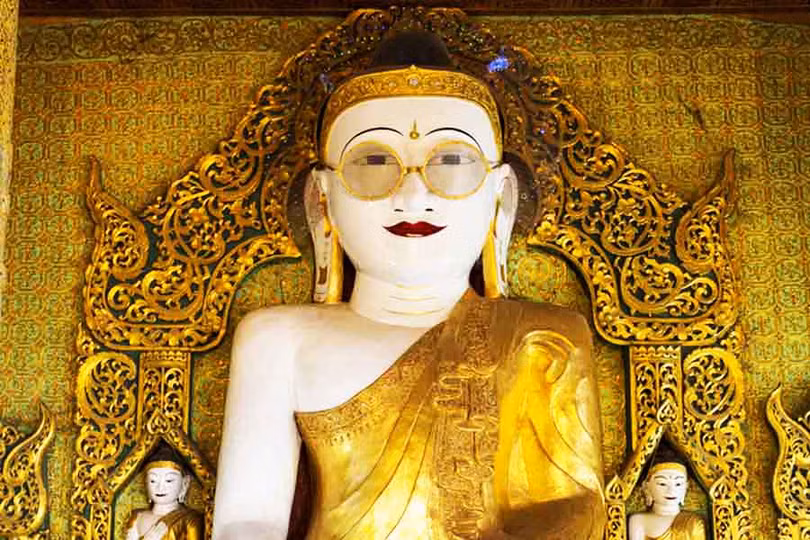 Bức tượng Phật “độc nhất” trên thế giới đeo một cặp kính với gọng mạ vàng và kính mắt tròn thuộc về chùa Shwe Myat Mhan, thị trấn Shwedaung, cách thị trấn chính Pyay (Prome) 15km về phía nam trên đường cao tốc Yangon, vùng Bago, Myanmar.
