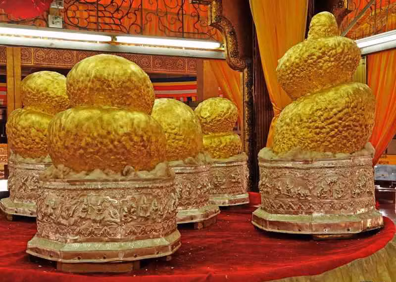 Ban đầu, năm bức tượng Phật nhỏ này có hình hài của Phật như những bức tượng khác. Nhưng do được phủ hàng ngàn lá vàng mỏng, năm bức tượng này đã không còn hình dạng như ban đầu.