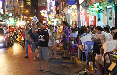 Còn rầm rộ hơn “phố ốc” Vĩnh Khánh, phố Tây ở phường Phạm Ngũ Lão, quận 1 hoạt động gần như cả đêm. Lúc chiều, phố Tây chỉ có vài quán cà phê, bar hoạt động, chưa chiếm hết vỉa hè. Nhưng chỉ đến 19 giờ, các quán nhậu bày biện bàn ghế ra chiếm hết vỉa hè, các quán kế nhau thì chia ranh giới bằng một chiếc xe máy đậu dưới lòng đường, nhân viên ngồi trên xe hoặc đứng dưới lòng đường lôi kéo, mời mọc khách.