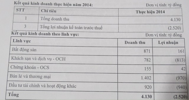 Năm 2014, OGC lỗ 2.520 tỷ đồng sau thuế, cổ đông công ty mẹ lỗ hơn 2.200 tỷ đồng. Cụ thể các khoản lãi/lỗ năm 2014 đến từ các lĩnh vực như sau: