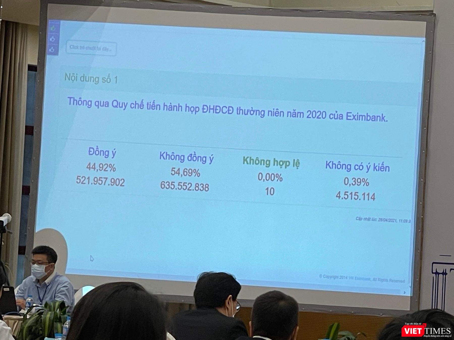 97 cổ đông “check-in” (bao gồm cả trực tiếp và ủy quyền), đại diện cho hơn 1,16 tỷ cổ phần có quyền biểu quyết ở Eximbank đã thể hiện rõ sự chia phe khi biểu quyết thông qua quy chế tiến hành đại hội: 44,92% đồng ý; 54,69% không đồng ý.
