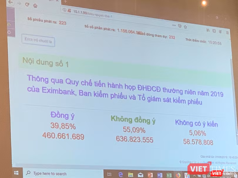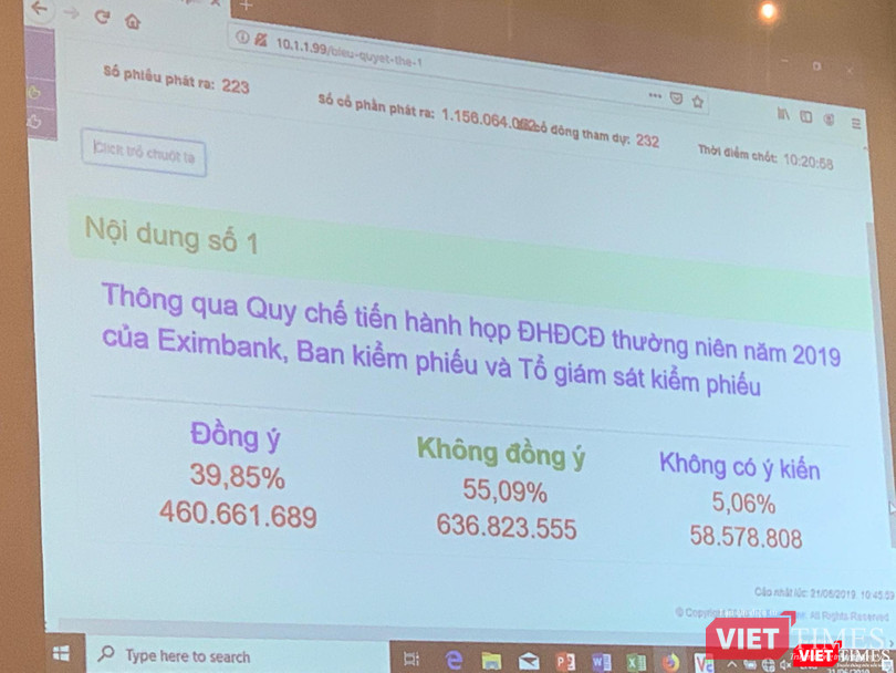 ĐHĐCĐ thường niên 2019 lần 2 của Eximbank có sự tham dự của các cổ đông đại diện cho 94% cổ phần có quyền biểu quyết. Cách đây 1 tháng, tại lần tổ chức thứ nhất, đại hội chỉ đạt được túc số hơn 57% và không đủ điều kiện để tiến hành.