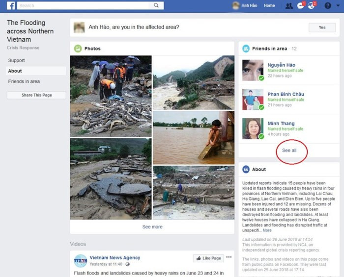 Bên cạnh phải của trang sẽ là danh sách những người thân đang trong vùng nguy hiểm, chúng ta bấm See all để xem danh sách đầy đủ (ảnh minh họa từ trận lũ Tây Bắc).