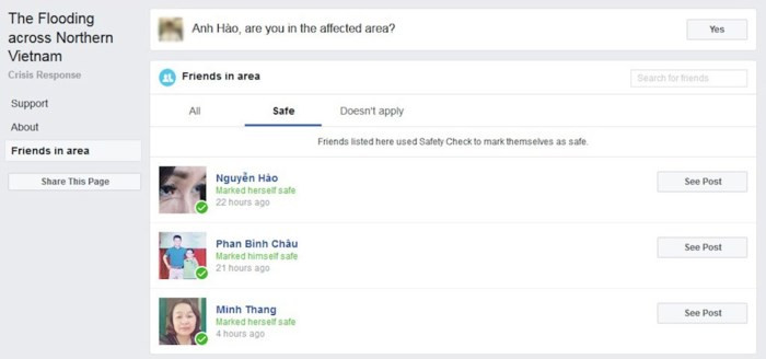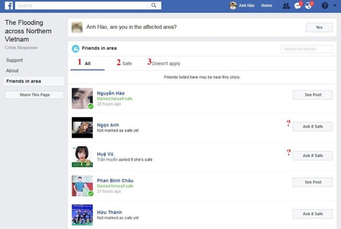 Bên cạnh đó, tất cả đều có thể kiểm tra xem đang có bao nhiêu người thân đang ở trong vùng bị ảnh hưởng, xem có bao nhiêu người đã đánh dấu an toàn, hơn nữa có thể gửi câu hỏi đến bất kỳ người nào ở đó xem đã an toàn chưa. Tất nhiên những người trong vùng bị ảnh hưởng cũng có thể tìm kiếm sự trợ giúp qua Facebook.