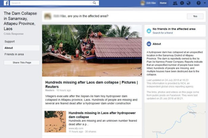 Hiện nay Facebook đã kích hoạt Safety Check cho trận vỡ đập ở Lào, và trang theo dõi thảm họa này mang tên "The Dam Collapse in Sanamxay, Attapeu Province, Laos" là ở đây.