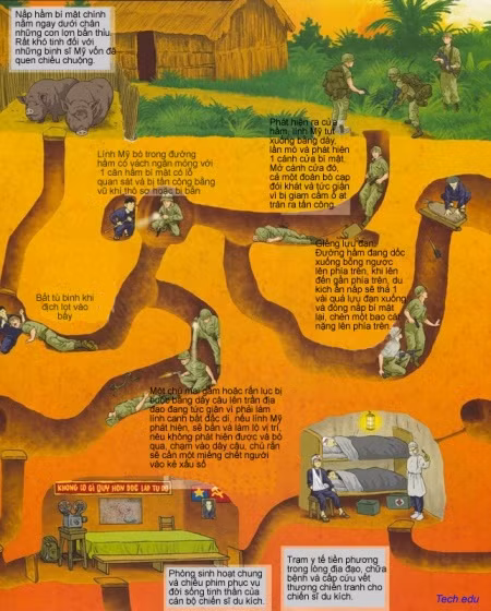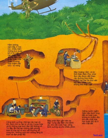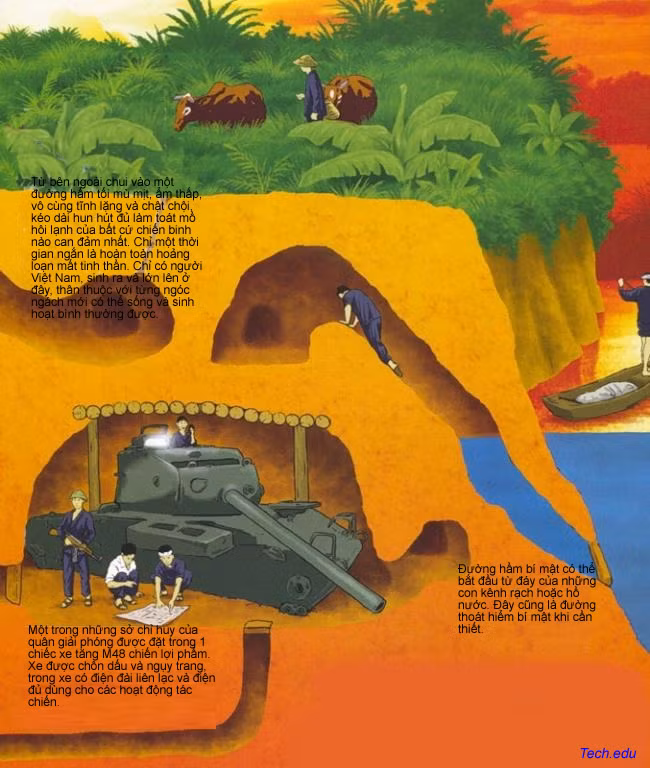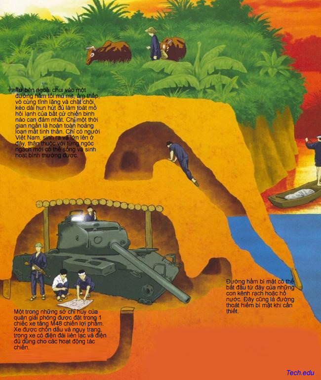 Nhưng du kích quân thông minh và khéo léo Việt nam, để tiết kiệm sức lực và thời gian, đã đào những đường hầm không sâu lắm, nhưng tính toán thiết kế sao cho, dù trong những trường hợp xe tăng và xe bọc thép di chuyển trên nóc hầm, phía trên bị nã pháo và ném bom- các đường hầm cũng không bị sụt, lún, sập và vẫn bển bỉ phục vụ những người đã xây dựng lên.