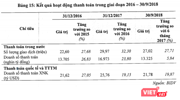 Đi cùng với tăng trưởng của số lượng giao dịch, doanh số thanh toán của BIDV cũng duy trì tốc độ tăng trưởng tốt. Cụ thể, tốc độ tăng trưởng của năm 2016 và năm 2017 so với các năm trước lần lượt là 26,83% và 23,8%. Tính tới ngày 30/9/2018, BIDV ghi nhận giá trị doanh số thanh toán đạt 13.325 nghìn tỷ đồng (tăng trưởng 5% so với 6 tháng 2017).