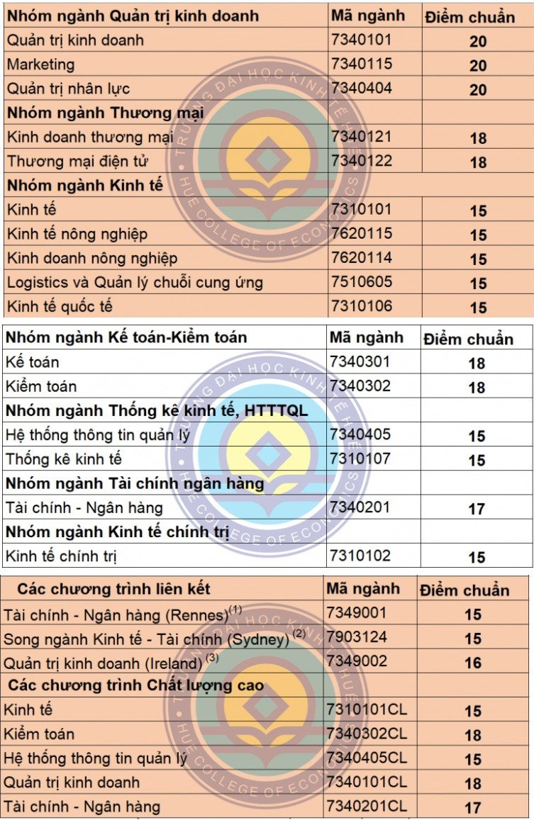Năm nay, trường Đại học Kinh tế - Đại học Huế tuyển sinh 1.800 chỉ tiêu. Mức điểm sàn của trường năm nay dao động trong khoảng 15 - 17 điểm. Trong đó, cao nhất ở mức 17 điểm có 3 nhóm ngành gồm Kế toán – Kiểm toán, Quản trị kinh doanh và nhóm ngành Thương mại. Điểm chuẩn sẽ được nhà trường công bố trước 17h ngày 5/10.