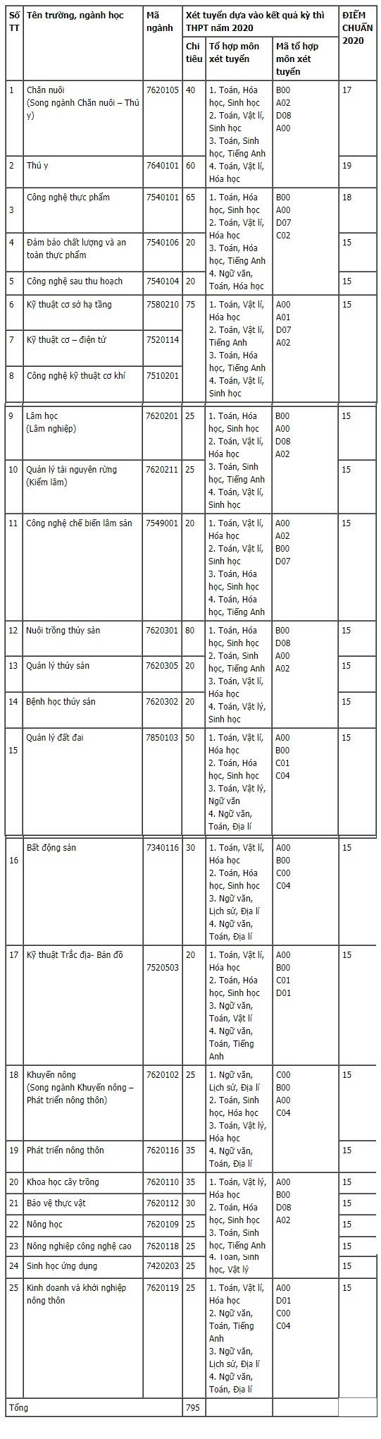 Năm nay, trường Đại học Nông Lâm - Đại học Huế tuyển sinh 1595 chỉ tiêu, trong đó có 795 chỉ tiêu xét tuyển theo thi THPT và 800 chỉ tiêu xét học bạ. Theo thông báo trên website chính thức, điểm chuẩn xét tuyển sẽ được nhà trường công bố trước 17h ngày 5/10.