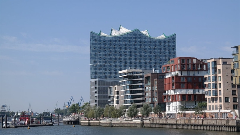 Elbphilharmonie có phần ngọn được cấu trúc bằng kính lấy cảm hứng từ cánh buồm của tàu thuyền hoặc làn sóng đại dương và cung cấp tầm nhìn tuyệt đẹp ra Hamburg và Elbe.