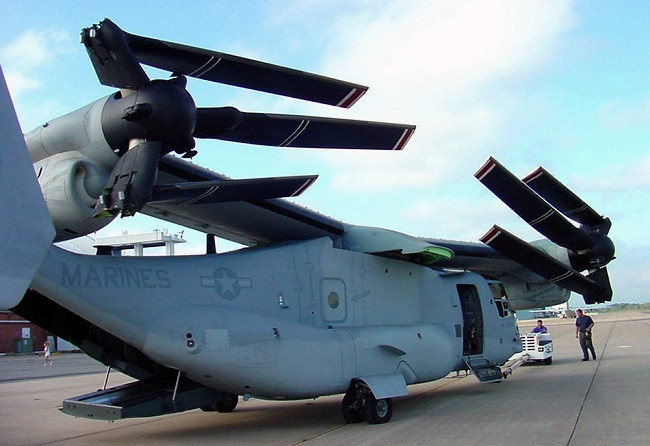 MV-22 Osprey là một thiết kế lai giữa trực thăng và máy bay cánh cố định. MV-22 có thể chở theo 24 binh lính hoặc 9.000 kg hàng hóa. Ưu điểm của máy bay là khả năng cất, hạ cánh như trực thăng trong khi có tốc độ nhanh gấp đôi. Osprey có vận tốc tối đa 500 km/h.