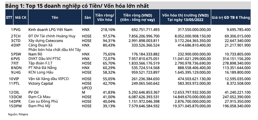 Thống kê từ FiinGroup cho thấy, nhiều cổ phiếu sau nhịp giảm mạnh, vốn hóa đã giảm về gần với giá trị khoản mục tiền mặt là tài sản được xem là có tính an toàn cao trong giai đoạn biến động lớn như khoản thời gian vừa qua. Danh sách lọc 15 cổ phiếu có tiền/vốn hoá lớn nhất không bao gồm các doanh nghiệp tài chính như: Ngân hàng, Bảo hiểm và Công ty chứng khoán.