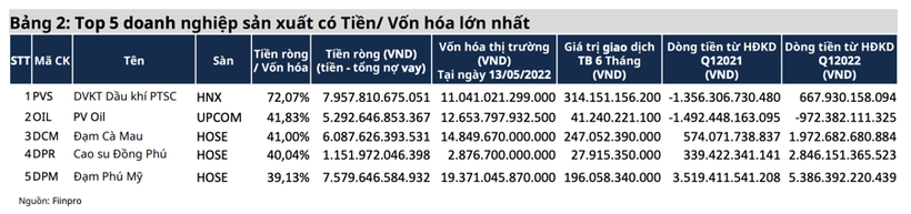 Dẫn dầu danh sách là PVS với giá trị tiền ròng/ vốn hóa đạt hơn 72%, dòng tiền từ hoạt động kinh doanh của PVS cũng cải thiện mạnh từ mức -1.356 tỷ đồng trong Q1/2021 lên mức 667 tỷ đồng trong Q1/2022.