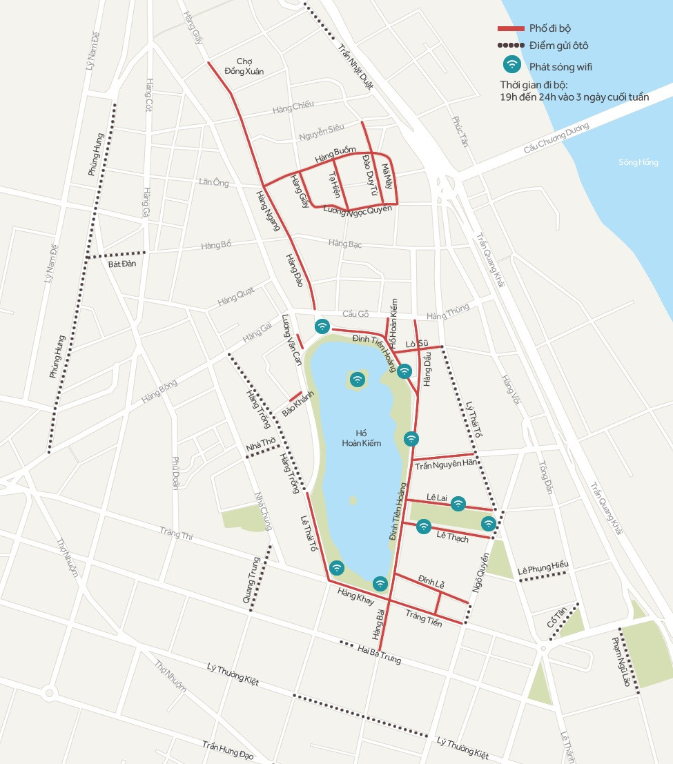 Dưới đây là chỉ dẫn phố đi bộ, điểm gửi ôtô và phát sóng wifi miễn phí ở không gian đi bộ khu vực hồ Hoàn Kiếm và phụ cận từ 19h thứ Sáu đến 24h Chủ nhật hàng tuần, bắt đầu từ ngày 1/9.