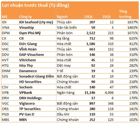 Một doanh nghiệp cũng có mức tăng trên 10 lần là Tổng Công ty Phân bón và Hóa chất Dầu khí (Đạm Phú Mỹ - HoSE: DPM). Cụ thể, DPM lãi trước thuế hơn 2.522 tỷ đồng, gấp 11,7 lần. DPM cho biết giá bán và sản lượng kinh doanh mặt hàng phân bón tăng mạnh trong quý 1/2022 dẫn đến doanh thu và lợi nhuận tăng tương ứng.