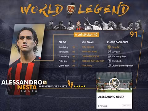 Một trong những trung vệ xuất sắc nhất mà nước Ý từng sản sinh ra, lá chắn vững chắc của bất cứ hàng phòng ngự nào, không ai khác chính là Alessandro Nesta. Trung vệ hào hoa, lãng tử này từng giành được hàng loạt danh hiệu cùng AC Milan, góp phần đưa đội bóng sọc đỏ đen trở thành một thế lực hùng mạnh, xưng bá khắp cả Châu Âu. Với khả năng xoạc bóng cực kì chính xác, ngay cả Messi cũng khó lòng vượt qua trung vệ người Italy.