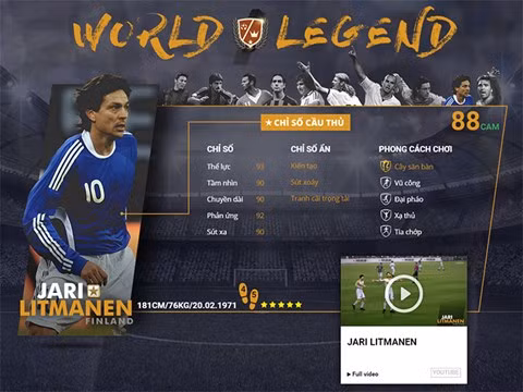 Jari Litmanen là huyền thoại bóng đá Phần Lan thi đấu ở vị trí tiền vệ tấn công. Sở hữu khả năng kiến tạo siêu hạng và khả năng ghi bàn cực tốt. Jari Litmanen từng giành chiếc cúp Champions League danh giá vào năm 1995 cùng Ajax, danh thủ này cũng có thời gian thi đấu cho Barcelona hay Liverpool. Jari Litmanen được xem là một trong những tiền vệ tấn công hay nhất thế giới và là cầu thủ vĩ đại nhất của Phần Lan.
