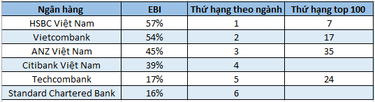 Theo khảo sát của Công ty Anphabe mới công bố, có 4 ngân hàng lọt top 100 nơi làm việc tốt nhất Việt Nam bao gồm: HSBC Việt Nam (7), Vietcombank (17), Techcombank (24) và ANZ Việt Nam (35).