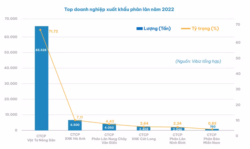 Theo thống kế của nhóm phân tích, 3 doanh nghiệp đứng đầu về sản lượng xuất khẩu mặt hàng này trong năm 2022 là CTCP Dap – Vinachem, Apromaco và Hà Anh Group với lượng xuất lần lượt là 69.927 tấn, 21.667 tấn, 13.330 tấn (tương ứng với tỷ trọng 55,6%, 17,23%, 10,58%).