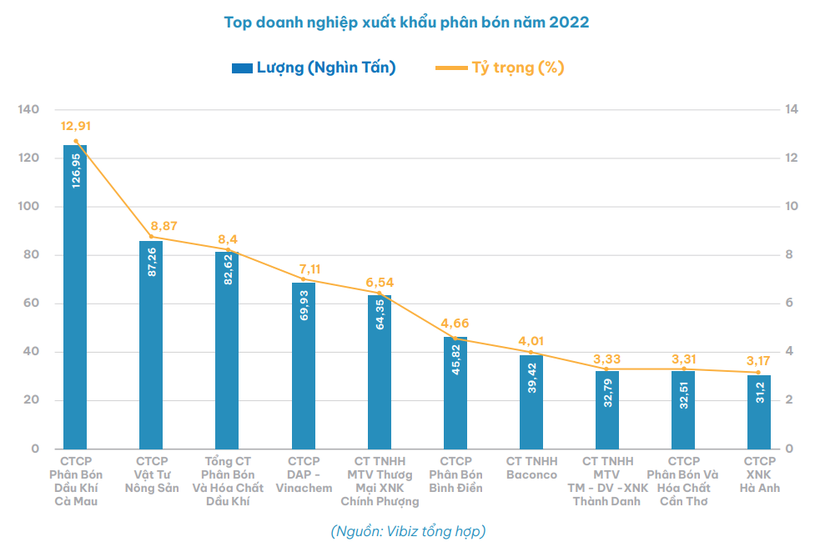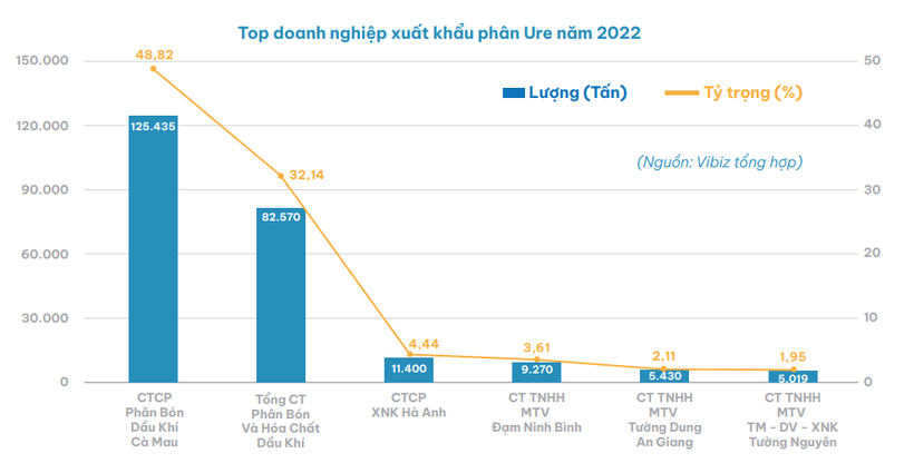 Một số doanh nghiệp lớn đứng đầu về xuất khẩu phân bón năm 2022 có thể kể đến như CTCP Phân bón Dầu khí Cà Mau (Đạm Cà Mau – DCM), CTCP Vật tư Nông sản (Apromaco) và Tổng Công ty Phân bón Và Hóa chất Dầu khí (Đạm Phú Mỹ - DPM).