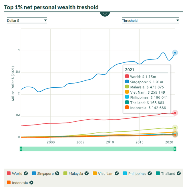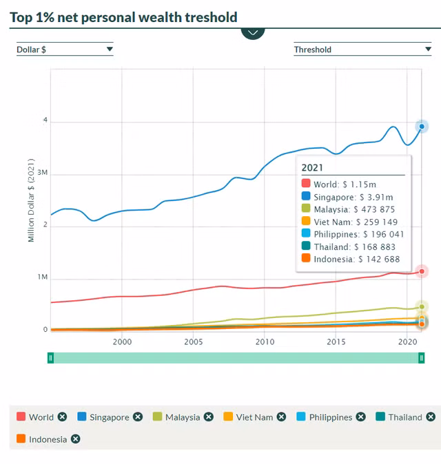 Xét trong nhóm ASEAN-6 (6 nền kinh tế lớn nhất ASEAN), ngưỡng để lọt top 1% của Singapore là cao nhất với 3,91 triệu USD. Để lọt top 1% của Malaysia thì chỉ cần khối tài sản 473.875 USD.