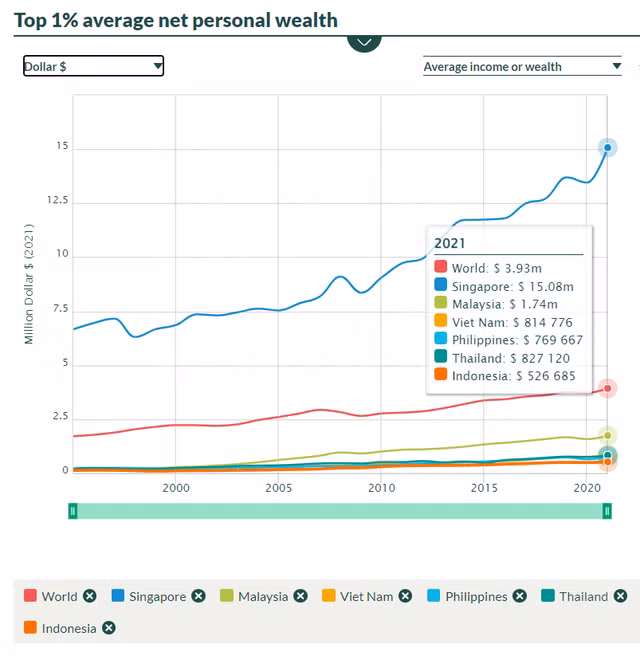 Nếu xét tài sản trung bình của top 1% dân số giàu nhất, thì top 1% dân số giàu ở Singapore có tài sản trung bình lên tới 15,08 triệu USD. Con số này ở Malaysia là 1,74 triệu USD, Philippines là 769.667 USD và Indonesia là 526.685 USD.
