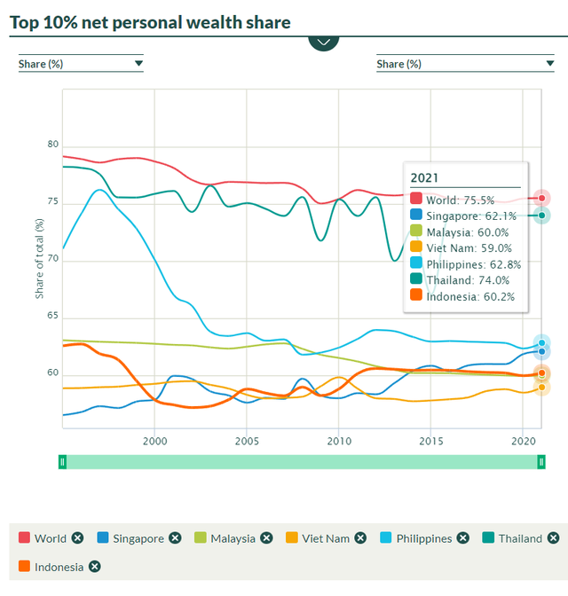 Song, nếu xét ở tỷ lệ 10% người giàu nhất, thì khoảng cách chênh lệch giàu nghèo giữa các nước không có quá nhiều khác biệt. Ở hầu hết các quốc gia ASEAN-6, trừ Thái Lan (75%), nhóm 10% này đều chi phối khoảng 60% tài sản quốc gia.