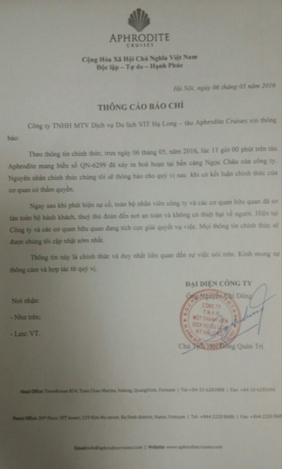 Cũng trong chiều cùng ngày, Công ty TNHH MTV Dịch vụ Du lịch VIT Hạ Long – đơn vị chủ quản của tàu du lịch gặp nạn đã phát ra thông cáo chính thức về việc tàu Aphrodite mang biển số QN-6299 đã xảy ra hỏa hoạn tại bến cảng Ngọc Châu.
