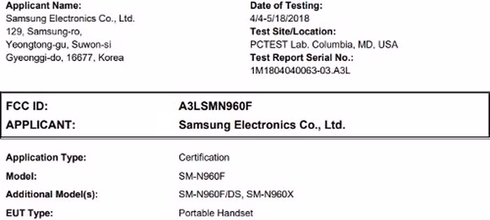 Samsung Galaxy Note 9 sẽ được phát hành tại Mỹ có thể có số model SM-N960U. Biến thể này hiện vẫn chưa xuất hiện tại FCC, nhưng điều này có thể sẽ sớm xảy ra. FCC đã nhận được Galaxy Note 9 với số model SM-N960F vào tháng 4/2018, tuy nhiên mãi đến hôm nay thiết bị mới đạt được chứng nhận của cơ quan này. Điều này cho thấy Samsung đã sẵn sàng cho kế hoạch ra mắt của chiếc phablet tốt nhất của mình.