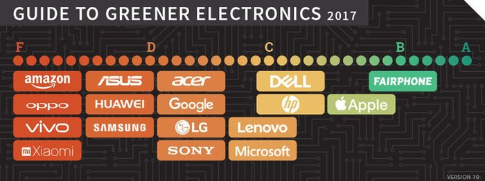 Ở bảng trên các hãng Amazon, Oppo, Vivo và Xiaomi đang ở mức độ F - báo động cao nhất, Samsung ở vị trí E tiếp theo, còn Apple và Fairphone đang nằm ở vị trí an toàn là B.