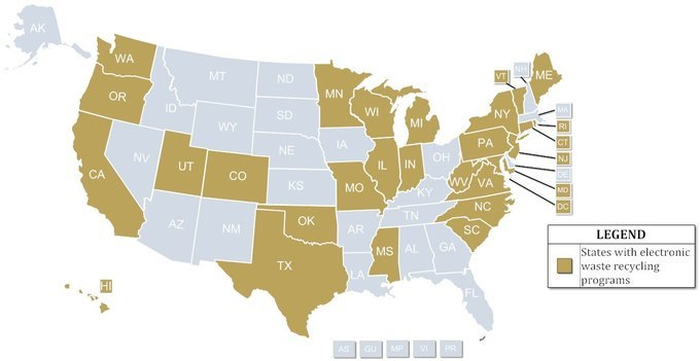 Tại Mỹ mọi quy định hầy như đều được ban hành ở cấp tiểu bang và đến nay đã có 25 tiểu bang triển khai các chương trình quản lý chất thải điện tử khác nhau. Trong sơ đồ nước Mỹ sau, màu vàng biểu thị cho những bang đang thực hiện chương trình xử lý thiết bị điện tử thân thiện với môi trường: