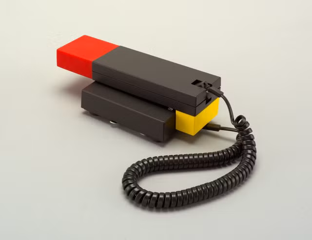 Đầu những năm 1980, một số công ty đã bắt đầu thử nghiệm những thiết kế điện thoại mới, đột phá. Mẫu điện thoại Enorme Telephone dưới đây nổi bật với màu sắc độc đáo và sự kết hợp của các khối hình hộp.