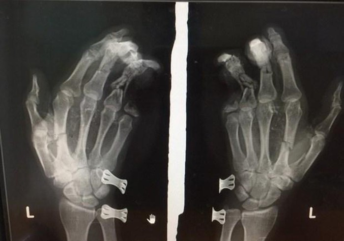 Phim chụp bàn tay của nam thanh niên bị tổn thương do điện thoại phát nổ.