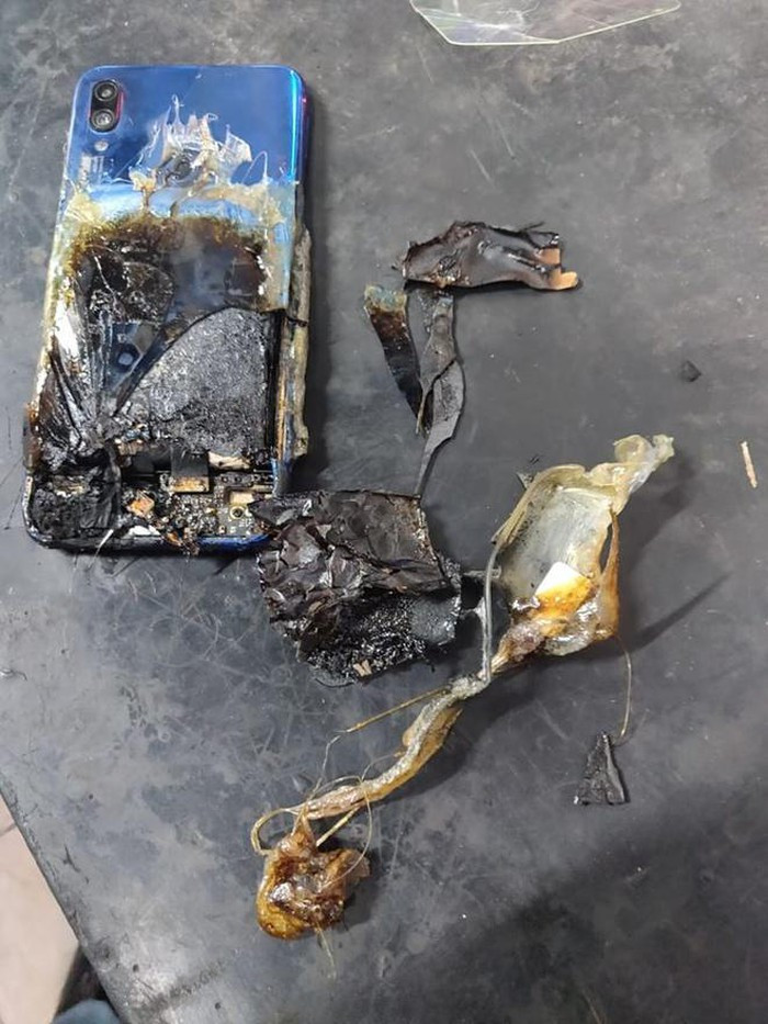 Chiếc Redmi Note 7 Pro của Yujie bị cháy hoàn toàn, pin và nắp lưng rơi ra khỏi máy. Ảnh: GizChina.